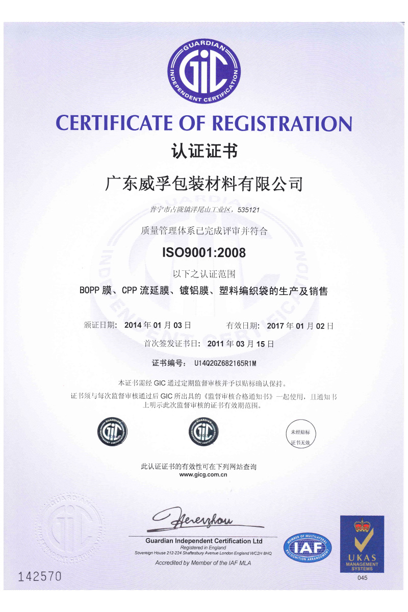 Weifu has been certified with ISO9001:2015 and ISO14001:2015. Also, Weifu’ s BOPP Line has achieved Global Recycling Standard, GRS certification, and EcoVadis social responsibility rating certification.